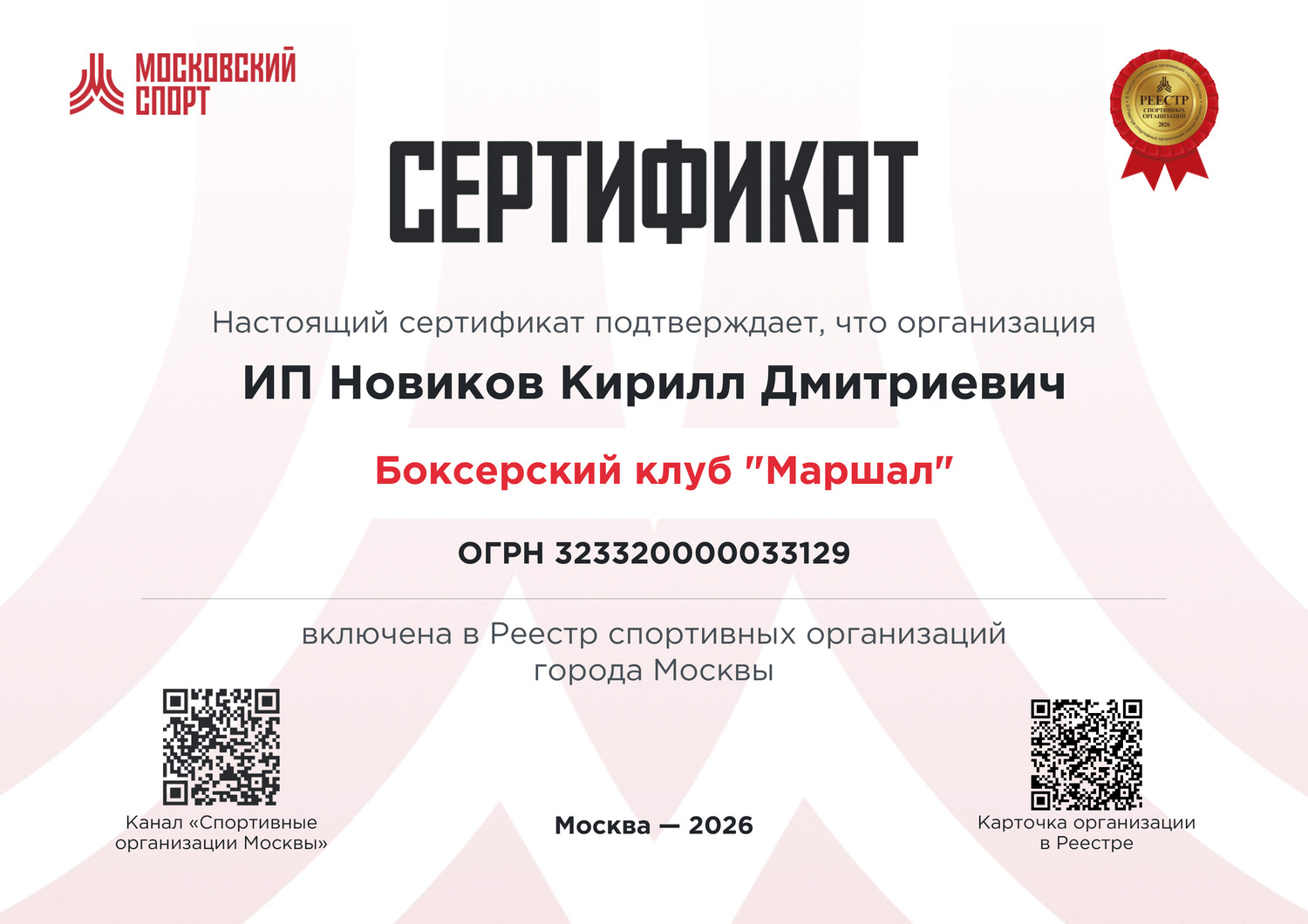 Главный тренер нашего клуба с 20-летним опытом наставничества, многократный победитель всесоюзных и международных турниров по боксу и лучший тренер СЗАО Москвы 2022 года. Тренерская работа Михаила отмечена грамотой Федерации Бокса Москвы и благодарностью Управы района Щукино.